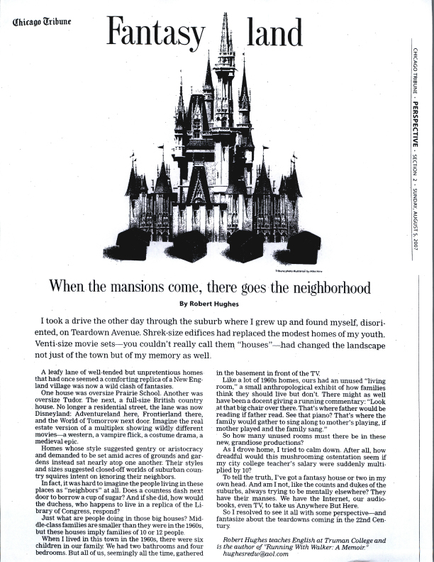 I took a drive the other day through the suburb where I grew up and found myself, disoriented, on Teardown Avenue. Shrek-size edifices had replaced the modest homes of my youth. Venti-size movie sets — you couldn’t really call them “houses” — had changed the landscape not just of the town but of my memory as well.