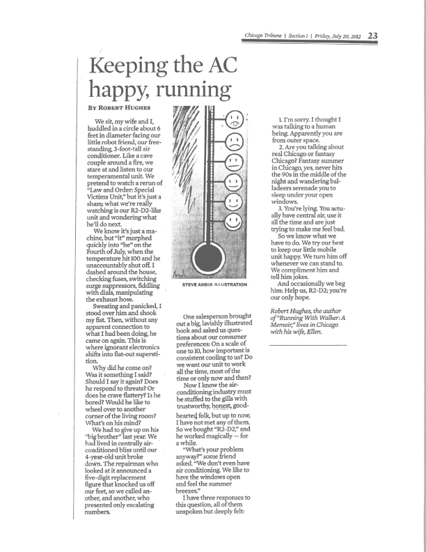 We sit, my wife and I, huddled in a circle about six feet in diameter facing our household god, our little robot friend, our free-standing three-foot tall air conditioner. Like a caveman family around a fire, we stare at, and listen to, our temperamental unit. We pretend to watch a rerun of “Law and Order: SVU,” but it’s just a sham; what we’re really watching is our R2D2-like unit and wondering what he’ll do next.