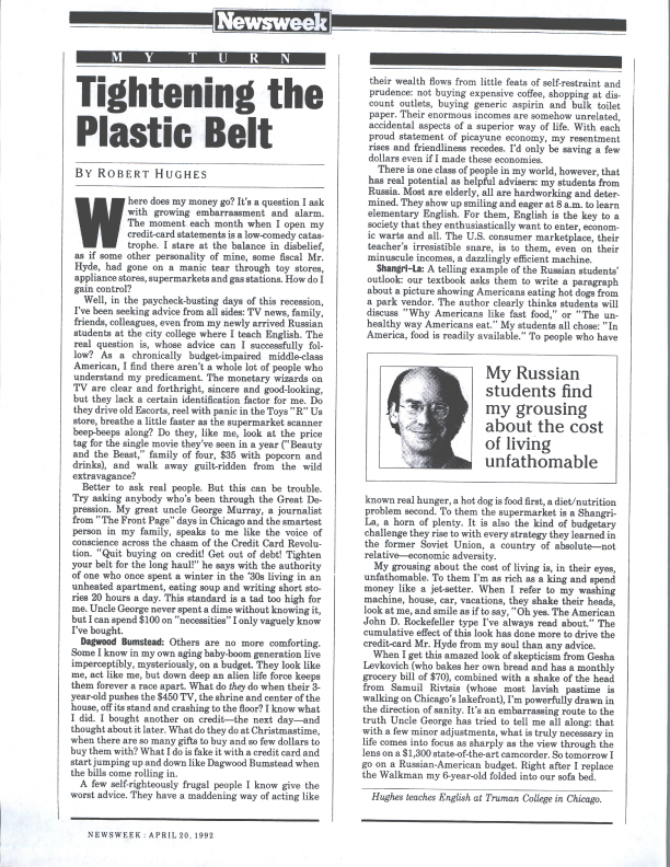 Well, in the paycheck-busting days of this recession, I’ve been seeking advice from all sides: TV news, family, friends, colleagues,even from my newly arrived Russian students at the city college where I teach English. The real question is, whose advice can I successfully follow? As a chronically budget-impaired middle-class American, I find there aren’t a whole lot of people who understand my predicament. The monetary wizards on TV are clear and forthright, sincere and good-looking, but they lack a certain identification factor for me. Do they drive old Escorts, reel with panic in the Toys ‘R’ Us store, breathe a little faster as the supermarket scanner beep-beeps along? Do they, like me, look at the price tag for the single movie they’ve seen in a year (“Beauty and the Beast,” family of four, $35 with popcorn and drinks), and walk away guilt-ridden from the wide extravagance?